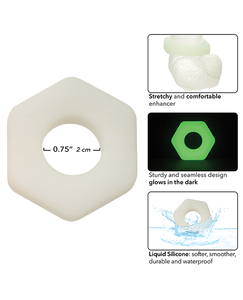 Introduce a new dimension of pleasure to your intimate life with the Alpha Glow-In-The-Dark Liquid Silicone Prolong Sexagon Ring. This top-tier enhancer is specifically designed to amplify and extend your sensual experiences. It assists in prolonging enjoyment, ensuring that your encounters are not only more gratifying but also last longer. The ring's unique glow-in-the-dark feature adds a touch of playfulness to your intimate moments, creating an enticing atmosphere and guiding you through the dark. Crafted with the highest quality Liquid Silicone, this ring is both stretchy for comfort and durable for longevity. Its robust yet adaptable design conforms effortlessly to your body, ensuring a snug and effective fit. The liquid silicone material has a soft, smooth texture, providing a firm yet comfortable grip without any discomfort. The sleek design seamlessly combines practicality with sophistication. Being completely waterproof, it invites exploration in various settings, enhancing the versatility of your intimate adventures. The Alpha Glow-In-The-Dark Liquid Silicone Prolong Sexagon Ring is a thrilling way to enrich any shared sensual experiences.