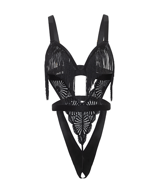 Get ready to play with the Annika Fringe Open Cup Teddy! This seductive teddy features fringe accents and adjustable straps for a hint of fun and flirty play. The open cup design and G-string back add to the intrigue. Spice up your lingerie collection with this playful piece. Small/Medium: Bust 30in. – 36in., Waist 24in. – 29in., Hips 32in. – 38in.