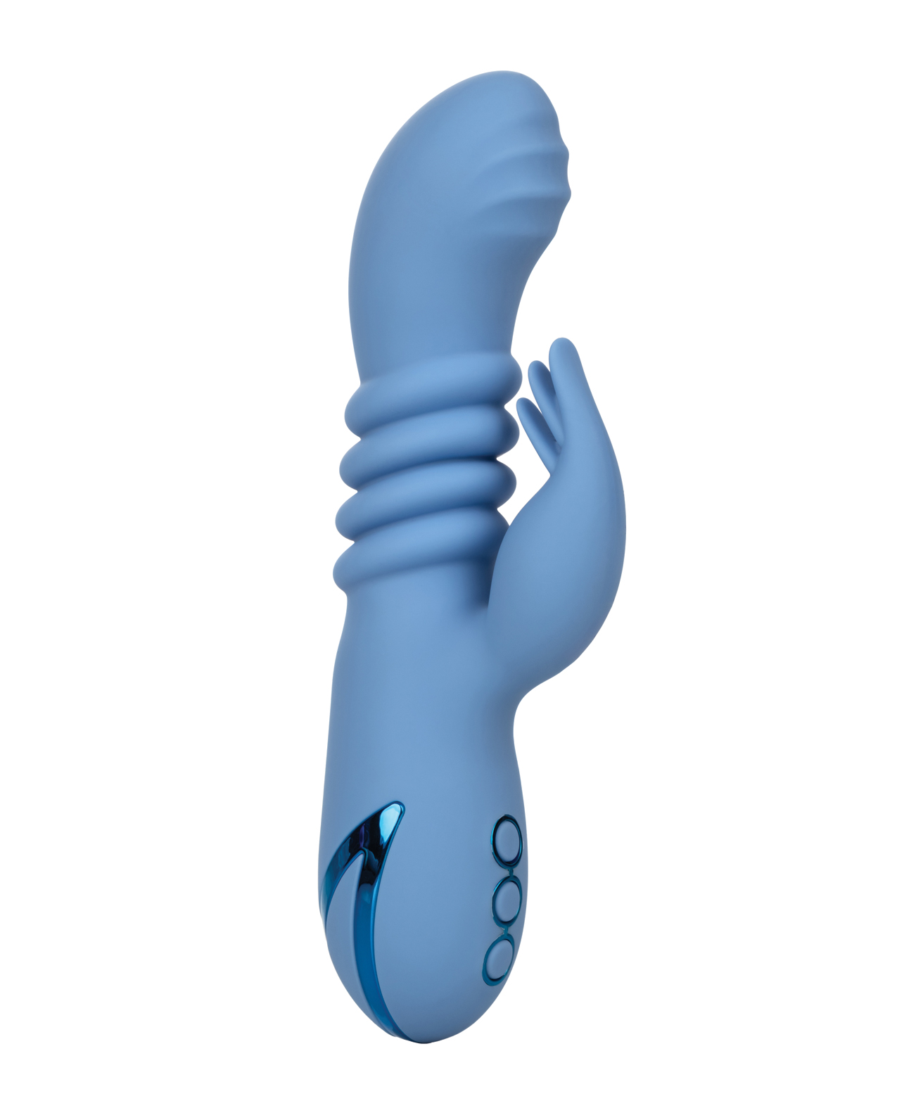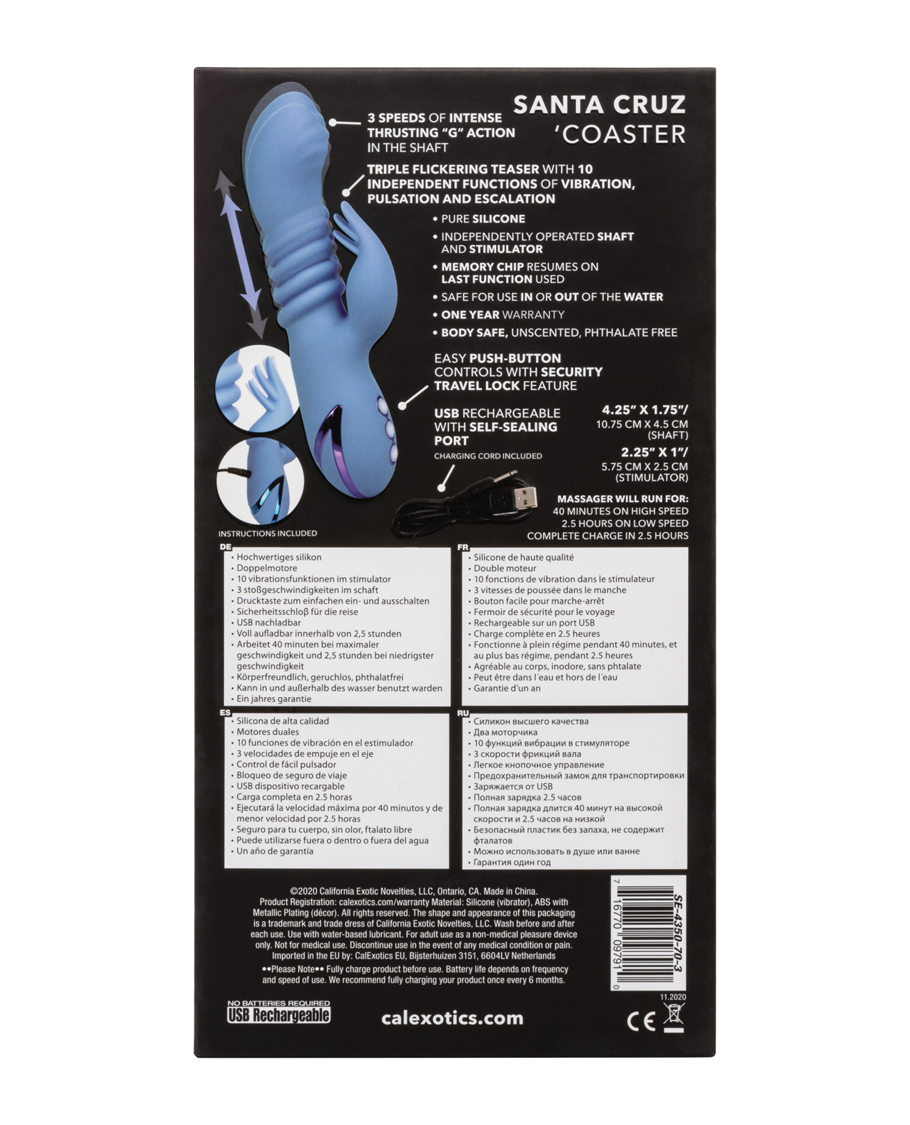 The California Dreaming Santa Cruz 'Coaster will give you the thrusting motion you've been searching for. This sex toy comes with a pinpointed teaser which flickers on an independent motion, as the thrusting vibrator mimics natures best, for maximum sexual wellness in a familiar form. For use by individuals or couples, this massager has a very powerful thrusting G-spot massager built into the shaft with three speeds of independent thrusting. The stimulator has 10 function of escalating vibration and stimulation, and the state-of-the-art memory chip resumes on the last function enjoyed. The power-safe travel-lock requires a three-second press, ensuring that the party never starts without you. This vibrator runs on 40 minutes while operating in high speed, or 2.5 hours on low, recharging with the included USB recharger in just 2.5 hours. Made of body-safe silicone and completely waterproof, you can rest assured that the 4.25 inch shaft of the California Dreaming Santa Cruz 'Coaster is up for the challenge, and the tickler will make sure that you are always taken care of in the most pleasurable of all possible ways. With the California Dreaming Santa Cruz 'Coaster– You can check in, but will you ever want to leave?