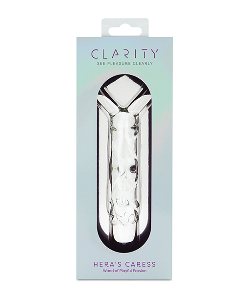 Heras Caress is a 5.9-inch glass dildo with a striking circular handle, designed for elegance, precision, and versatile pleasure. Handblown from premium borosilicate glass, Heras Caress combines refined artistry with ergonomic functionality. Its slim, gently curved shaft is crafted to target the G-spot or prostate with ease, while the seamless surface ensures a smooth, effortless glide. The sculpted circular handle provides a secure grip and comfortable control, making it ideal for both solo exploration and partnered intimacy. Perfect for temperature play, it can be gently warmed for soothing comfort or cooled for thrilling contrast. Non-porous, body-safe, and easy to clean, this piece is as practical as it is visually striking. Equally suited to beginners or experienced users, Heras Caress offers an elegant balance of beauty and performance.