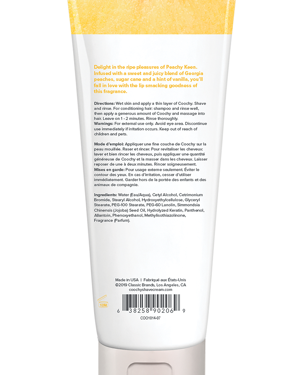 Coochy Rash Free Shave Cream dramatically reduces cuts, nicks, scrapes and razor irritation. It contains a special conditioner and moisturizing complex that provides an effortless glide for an oh so smooth shave. Your coochy will love you for it! Why It's Different: The conditioner and moisturizing complex provides the perfect lubrication and razor glide. Jojoba Seed Oil provides a protective barrier for skin and helps seal in moisture. COOCHY does not contain unnecessary foaming agents. Tip: As with any shaving cream, soak skin and exfoliate before shaving. If necessary, follow with an after-shave protection mist. PEACHY KEEN: Infused with a sweet and juicy blend of Georgia peaches, sugar cane and a hint of vanilla. You'll fall in love with this lip-smacking fragrance.