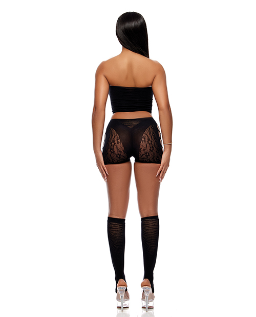 3pc. Floral and animal print criss cross detail seamless top bodystocking with opaque bra outline and rhinestone accents paired with matching briefs and open toe socks. Includes: Top, Briefs And Open Toe SocksFabric Content: Shell: 95% Nylon 5% SpandexPullover Closure.Footwear Not Included. O/S . Cup: B-C. Bust: 32in.-40in. Waist: 24in.-32in. Hip: 36in.-44in.