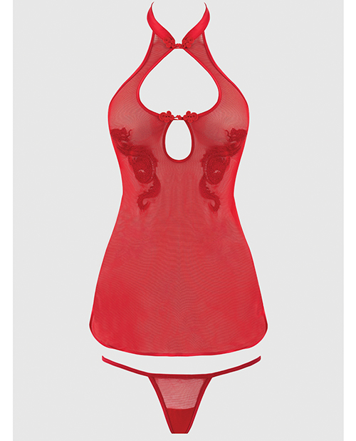 Be a siren in the Dragon Chemise, a sheer spectacle crafted in mesh with enchanting dragons adorning your chest. This slip of a dream is all about the tease. Featuring playful keyholes and an open back that begs to be untied. Complete the enticing look with the matching G-string or dare to bare more. Fabric: CHEMISE: SHELL: 95% NYLON, 5% SPANDEX. SATIN: 100% POLYESTER. PANTY: 95% NYLON, 5% SPANDEX Care: HAND WASH COLD WATER. NON-CHLORINE BLEACH. HANG TO DRY. DO NOT IRON. Large – Bust: 38-39 inches. Waist: 32-33 inches. Low Hips: 41-42 inches. US Dress 10/12.