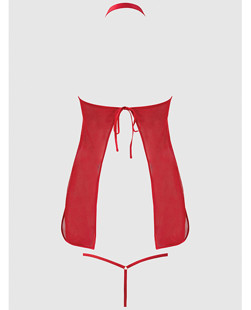 Be a siren in the Dragon Chemise, a sheer spectacle crafted in mesh with enchanting dragons adorning your chest. This slip of a dream is all about the tease. Featuring playful keyholes and an open back that begs to be untied. Complete the enticing look with the matching G-string or dare to bare more. Fabric: CHEMISE: SHELL: 95% NYLON, 5% SPANDEX. SATIN: 100% POLYESTER. PANTY: 95% NYLON, 5% SPANDEX Care: HAND WASH COLD WATER. NON-CHLORINE BLEACH. HANG TO DRY. DO NOT IRON. Small Bust: 33-35 inches. Waist: 27-28 inches. Low Hips: 37-38 inches. US Dress 2/4.