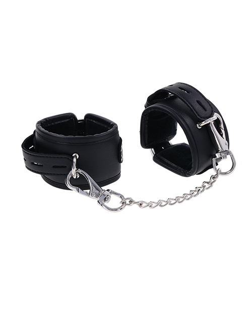 Take control with the Edge Handcuffs, the perfect complement to your power play. These matching black cuffs are padded for comfort and durability, designed for extended wear and secure restraint. Featuring sleek silver metal hardware and reinforced stitching, theyre built to withstand even the most intense sessions. The adjustable buckle closure ensures a customizable fit, while a sturdy rings allow for versatile attachment to other restraints or bondage gear. Whether you're a seasoned pro or a curious beginner, the Edge Handcuffs offer a perfect balance of comfort and control.