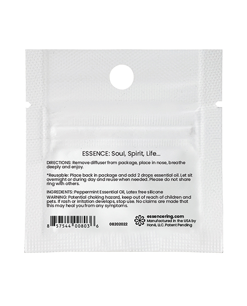 Peppermint, celebrated since ancient Greek and Roman civilizations, is a true superstar in combating nausea and digestive discomfort. It's also renowned for its remarkable ability to alleviate recurring headaches and migraines. The Peppermint Scent diffuser ring captures the essence of this age-old remedy.Expertly crafted with a blend of pure peppermint essential oil and soothing carrier oils, our diffuser ring strikes the perfect balance, ensuring a harmonious aroma without any irritation. Experience the soothing and cooling properties of peppermint in a seamless and gentle manner.Choose the Peppermint Scent diffuser ring to unlock the remarkable benefits of this time-honored botanical. Elevate your well-being, soothe digestive woes, and find relief from headaches with the invigorating power of peppermint. Upgrade your aromatic experience with our Peppermint Scent diffuser ring today! Not recommended for use by children under the age of 3 *ring is reusable up to 30 times, but only if the user adds their own drops of oil back to the sachet