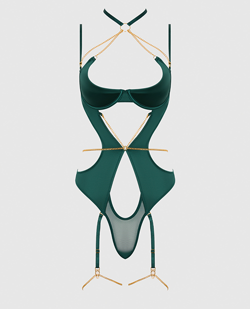 A dangerously sexy one piece, the Evangeline Satin & Chain Halter Teddy elevates the allure with its dreamy fabric and luxe accents. Sleek liquid satin and mesh envelops your figure while gilded chains wrap across the skin, highlighting the bust, waist, and thighs. Adjustable chains customize to your body for a fit that flatters every figure. Fabric Content: SHELL: 76% NYLON, 24% SPANDEX. MESH: 88% NYLON, 12% SPANDEX. EXCLUSIVE OF TRIMS AND ELASTIC. Care: HAND WASH COLD WATER. NON-CHLORINE BLEACH. HANG TO DRY. DO NOT IRON. 3X/4X – Bust: 44-45 inches. Waist: 38-39 inches. Low Hips: 47-48 inches. US Dress 22/24.