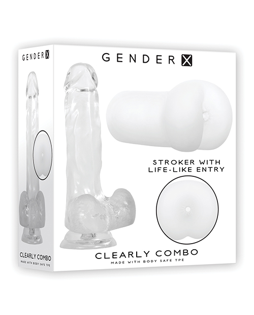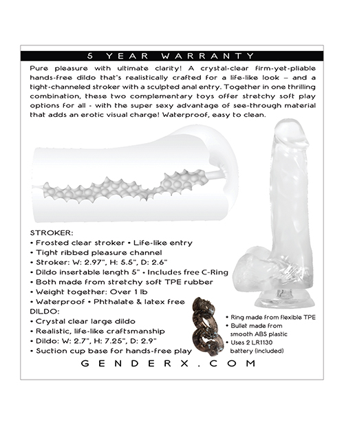 Pure pleasure with ultimate clarity! A crystal-clear firm-yet-pliable hands-free dildo thats realistically crafted for a life-like look and a tight-channeled stroker with a sculpted anal entry. Together in one thrilling combination, these two complementary toys offer stretchy soft play options for all – with the super sexy advantage of see-through material that adds an erotic visual charge! Clear dildo & stroker set Dildo: Crystal clear large dildo Realistic, life-like craftsmanship Suction cup base for hands-free play Stroker: Frosted clear stroker Life-like anal entry Tight ribbed pleasure channel Dimensions: Dildo – Overall Length – 7.25 inches Insertable Length – 5 inches Width – 2.7 inches Stroker – Overall Length – 5.5 inches Width – 2.97 inches Material: Both made from stretchy soft TPE Five Year Warranty.