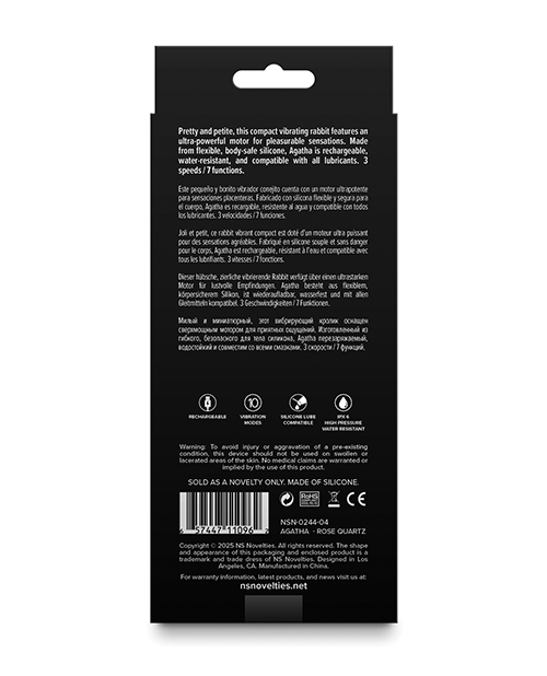 Pretty and petite, this compact vibrating rabbit features an ultra-powerful motor for pleasurable sensations. Made from flexible, body-safe silicone, Agatha is rechargeable, water-resistant, and compatible with all lubricants. 3 speeds / 7 functions.