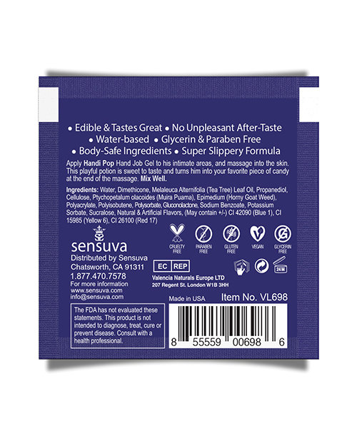Let your hands work their magic to give him a lap massage he will never forget. HandiPop was created to be ultra slippery so that it extends the length of your hand massage, inviting him to enjoy every single one of your tickles, glides, squeezes and caresses to his favorite body part. It is fun to use with just your hands, OR combine it with other men's pleasure products like masturbation sleeves, textured toys and anything with vibration. At the end of your hand massage you can turn him into your favorite lollipop because this playful potion tastes absolutely amazing, which makes it a pleasure for you both