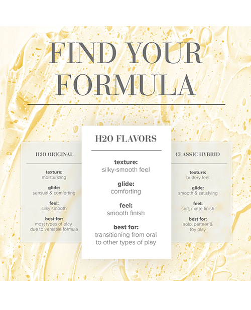 JO H2O Classic Flavors are the original water-based flavored lubricants from the JO brand. Theyre made with the highest USP Grade (99.7%) plant-based glycerin, and theyre water-based for easy cleanup. Not compatible with polyurethane condoms. Key Ingredient. Glycerin – Highest USP Grade (99.7%) plant-based glycerin. Used as the primary glide ingredient.
