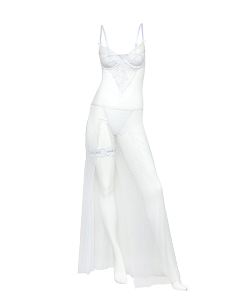 Indulge in luxury with the Bridal Livia Sheer Gown & Garter Set. The stunning mesh gown features an adjustable strap underwire bra and elegant bow detail. Complete the look with the delicate lacey garter. Perfect for a bridal shower gift, this set exudes sophistication and allure. 1x/2x: Cup C/DD, Bust 40-44:, Waist 32-40in., Hips 42-50in.