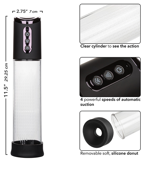 Elevate your experience to extraordinary heights with the Peak Rechargeable Pump, a state-of-the-art device designed for those who seek power and convenience in their personal pleasure pursuits. This rechargeable automatic pump offers incredible suction at the touch of a button, making it a revolutionary tool in the realm of intimate enhancement. Perfect for those who appreciate efficiency and effectiveness, this pump is a testament to advanced design and user-friendly functionality. Featuring four powerful speeds of automatic suction, the pump allows you to customize your experience to match your desires. Each level of suction is designed to offer a different intensity, providing a range of sensations that cater to your personal preferences. Whether you're seeking gentle pressure or a more robust experience, this pump has you covered. The easy-grip controller is designed for single-handed use, ensuring your other hand is free to explore. This ergonomic design enhances the overall experience, making it seamless and enjoyable. Additionally, the removable soft Silicone donut ensures comfort and a snug fit, enhancing the effectiveness of the suction and overall experience. The clear cylinder allows you to see the action, adding an element of visual excitement to your experience. For ease of use and convenience, the pump features an easy push-button control and a quick air release button. Disassembling for cleaning is effortless, ensuring hygiene and longevity. USB rechargeable, with a complete charge achieved in just 2 hours, the pump can run for 120 minutes on high speed and 180 minutes on low speed. Boost your enjoyment with the Peak Rechargeable Pump, a modern device carefully created to take your experiences to their highest peaks.
