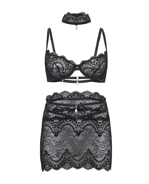 This is the quintessential lingerie ensemble. The Perla consists of a 3-piece lace bra and matching skirtini, both embellished with a pearl-adorned lace choker. This luxurious set exudes sensuality, elegance, and refinement. Large/XL: Bust 36in. – 40in., Waist 29in. – 33in., Hips 38in. – 42in.