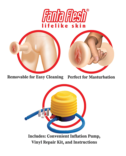 Pipedream Extreme Dollz Hannah Harper Life-Size Love Doll. This incredible life-size inflatable love doll was meticulously designed with realistic features for a truly lifelike experience. Her sexy 3-D formed head features realistic eyelashes and a luxurious head of real hair that's begging to be pulled! Watch her really come to life with arms that swivel 360 degrees and delightfully painted finger and toenails. Give her firm and perky breasts a squeeze while you enjoy her ultra-lifelike Fanta-Flesh skin, pussy, and ass that feels even better than the real thing! The Fanta-Flesh pussy and ass are removable for easy in-depth cleaning, and can even be enjoyed separately for masturbation. An inflation pump, vinyl repair kit, and instructions are conveniently included. Body: Vinyl. Head, Hands, Breasts & Feet: Silicone. Vagina & Ass: TPR. Hair: Polyester.