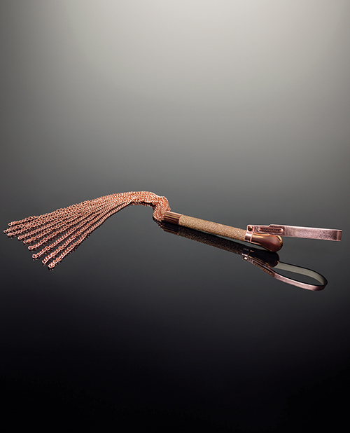 Pleasure Collection Chain Whip. Metal chain whip strands handle for expert level impact play. Rhinestone studded handle.Wrist strap circumference: 11 (27.5cm)Metal COQUETTE charm.Rose Gold.Pleather/Metal.