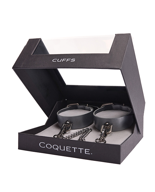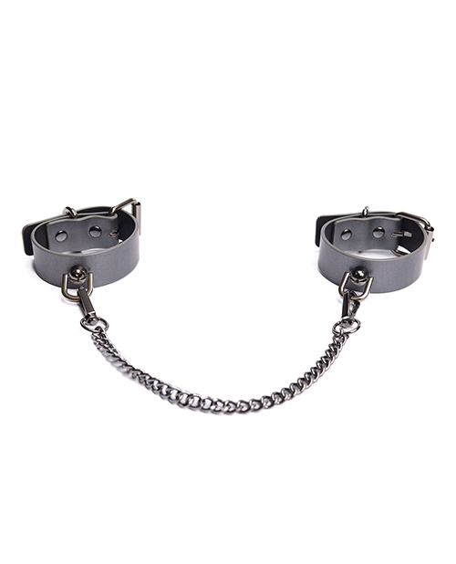 Experience ultimate luxury and sensuality with our Gunmetal Glam Handcuffs. Made from adjustable 1" (2.54cm) wide cuffs, these cuffs feature a removable chain and buckle closure for added flexibility and excitement. Embossed with the logo, the total cuff length is 10 1/2" (26.7 cm) with a chain length of 8" (20.3 cm). Perfect for wrist sizes up to 6 1/2" (16.5 cm).