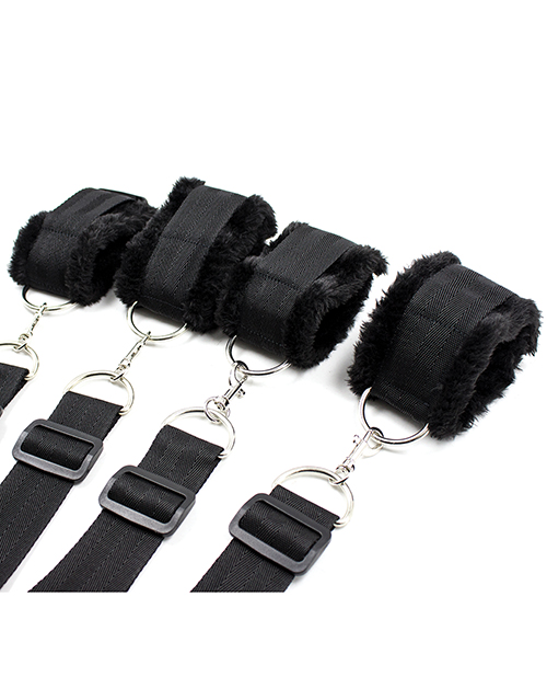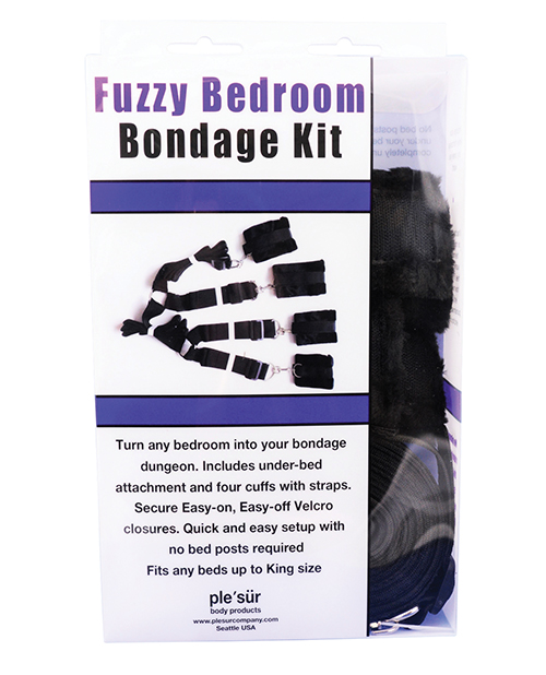 Bedroom bondage kit includes fuzzy and comfortable wrist and ankle cuffs plus all the attachments to turn any bed into your bondage bed. No bed posts needed with the cuff attachment that connects all cuffs under the bed, without having to tie up to bed posts. You will secure your love to play out all your fantasies! This set is long and will fit king size beds.