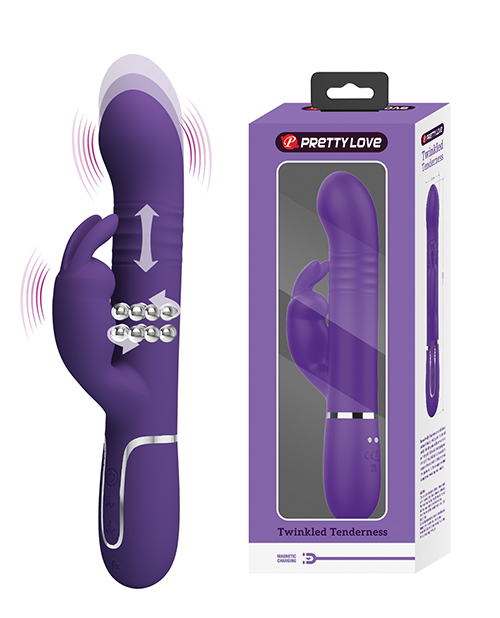 Designed for maximum pleasure, stay in bed with the Pretty Love Rabbit Vibrator. With powerful twin motors, one located at the tip and the other on the outer arm, we promise you'll find your perfect vibration as 7 vibration intensities and rhythms bring you to a powerful blended climax. With a single row of rigid beads that travel up and down in an exciting intimate massage, enjoy three speed settings while constantly rubbing your sensitive sweet spot. For added pleasure, press the Burst Climax button to explore your incredible, earth-shattering orgasms. One Year Manufacturer Warranty.