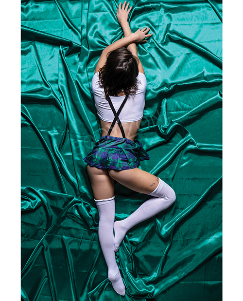 Role Play Sultry School Babe by Body Zone Apparel. 6 piece Sultry School Babe set: 1 skirt, 1 top, 1 clip on tie collar, 1 pair of knee high stocking, 1 pair of glasses, 1 pair of suspenders. Size M/L. Fabric: 80% Poly/20% Elastane, Stockings: 85% Nylon/15% Elastane. Hand Wash Cold. No Bleach. Line Dry. M/L. Size (U.S.) 8-12. Bust – 35.5"-38. Waist – 28- 30.5. Hips – 38.5- 41