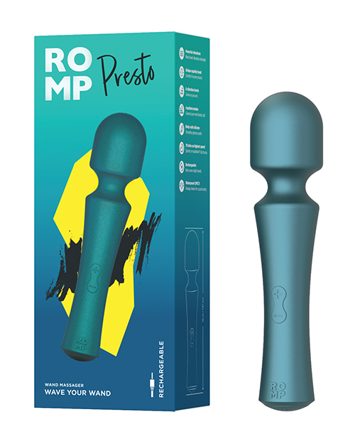 ROMP Presto is a compact wand vibrator designed for solo masturbation or partner play. Take orgasmic magic into your hands and play with the 6 vibration intensities and 4 pattern modes. With the wave of the wand, experience the sensational, unique squishy silicone head on your skin. Versatile, rechargeable and waterproof, Presto offers pure pleasure magic. 2 year warranty.
