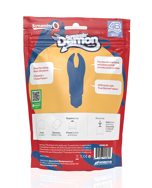Screamin Demon 4B Mini Vibe. Deep-rumbling Bass Vibrations with 5 speeds + 1 pulse pattern.Flexible silicone horns and pleasure nub provide powerful vibes.100% Body-safe True Silicone sleeve. Reusable. Waterproof.