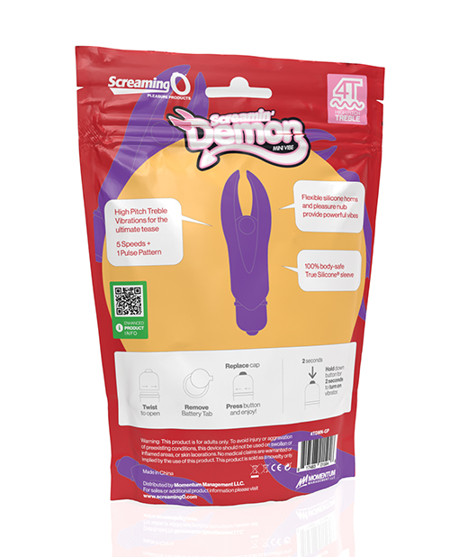 Screamin Demon 4T Mini Vibe. High Pitch Treble Vibrations with 5 speeds + 1 pulse pattern. Flexible silicone horns and pleasure nub provide powerful vibes.100% Body-safe True Silicone sleeve. Reusable. Waterproof.
