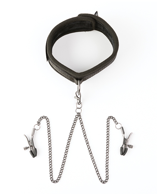 Indulge in the perfect blend of elegance and excitement with the Sei Mio Twin Tweaks Collar and Nipple Clamps set. This beautifully crafted collar, made from velvet-soft faux leather, rests comfortably around the neck while setting the stage for playful restraint. Attached silicone-tipped nipple clamps offer an enticing pinch with gentle comfort, allowing you to adjust intensity with ease. For added versatility, the clamps can be unclipped from the collar and used independently, making it simple to switch up your play. Perfect for those looking to explore new levels of sensual teasing, the Twin Tweaks set is an alluring addition to your intimate collection, inviting you to control, captivate, and thrill with every touch.