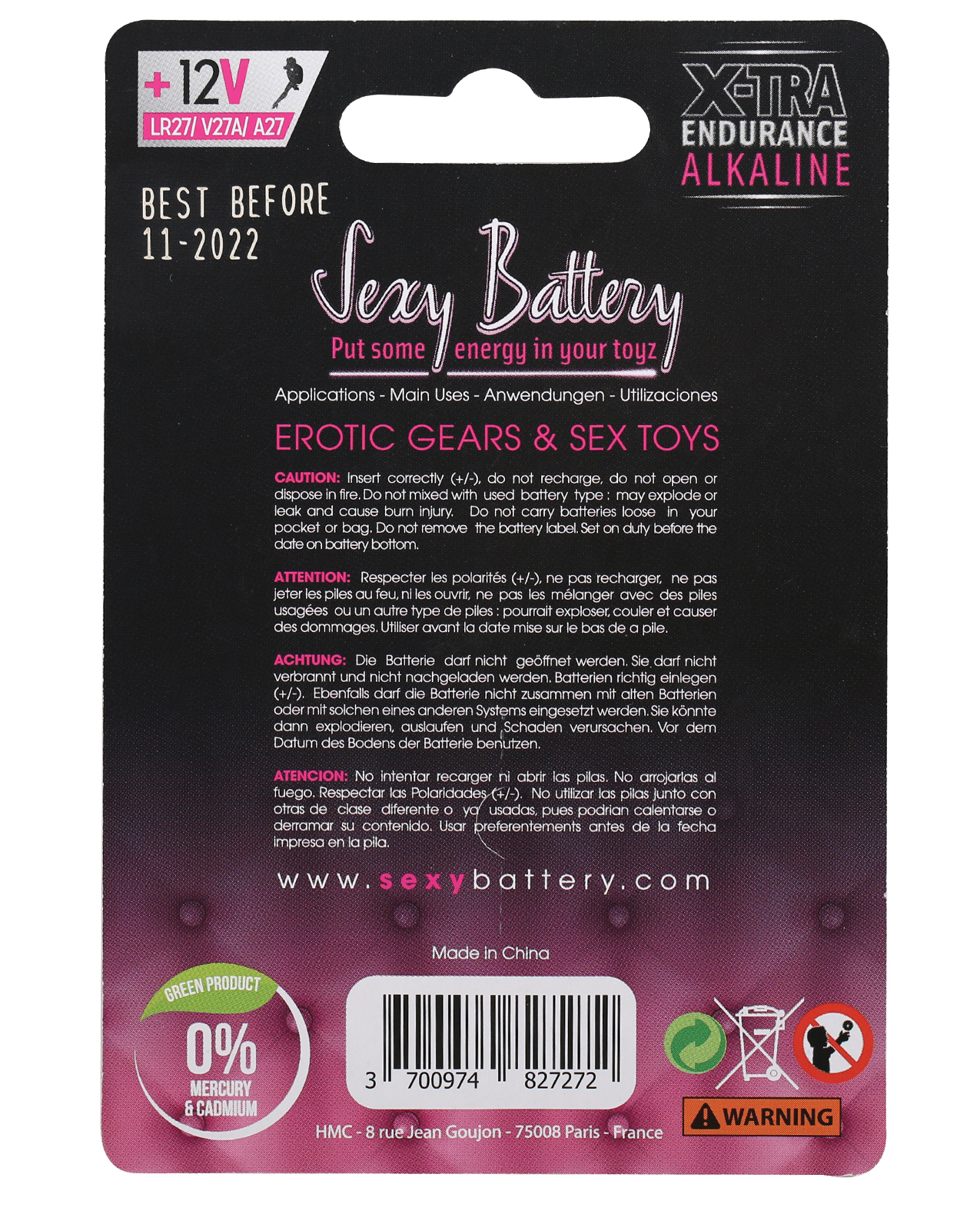 Sexy Battery 27A -12 volt. Also known as: G27A / MN27 / GP27A / A27 / L828 / EL812 / EL-812 / CA22 / B-1 / SNN4176A / ALK27A / A27BP / K27A / V27GA / VA27GA / VR27 / MN27 / MS27 / R27A