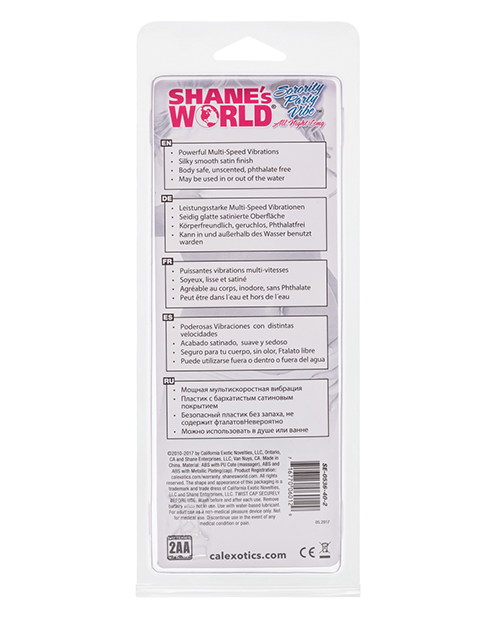 Party all night long until you just cant orgasm anymore with the Shanes World Sorority Party Vibe-All Night Long. If youre looking for the vibe that will go deeper, harder, and longer and matches your boundless craving for pleasure, this sex toy is for you. It measures in at 6.5 inches long and 1 inch wide, so itll be sure to hit all the right spots when you slip it inside of you. The vibrant toy is perfect for any stimulation: Use it on your clit, your lips, or slip it inside you to see if you can take all of its long 6.5 inches. This adult toy is specially designed to provide powerful, multi-speed vibrations. Its easy to use: Just twist off the battery cap, slide in two AA batteries, and replace the battery cap. Then turn the base until you find your favorite speed and intensity of the many available, lay back, and let the orgasms roll in. The sex toy is perfect for beginner exploration or seasoned vibe users. Its long enough to hit every imaginable spot and help you explore every inch of yourself. The Shanes World Sorority Party Vibe-All Night Long is covered in a silky-smooth, velvety coating that will drive you positively wild. Its even 100 percent waterproof for seriously sexy fun in and out of the water. Go all night long or give yourself a quickie with this wonderfully smooth and seamless vibrator.