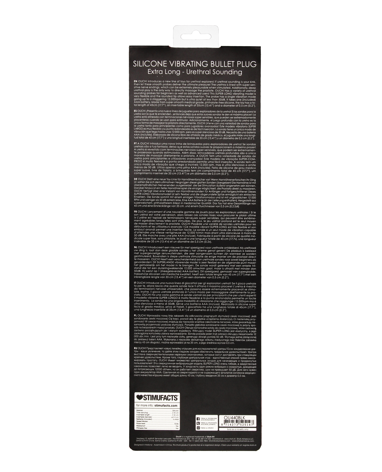 OUCH! Introduces a new line of toys for urethral explorers! If urethral sounding is your kink, then let these smooth probes deliver the ultimate pleasure! The urethra is lined with super-sensitive nerve endings, which can be extremely pleasurable when stimulated. Additionally, deep urethral play is the only way to directly massage the prostate. OUCH! Has a variety of urethral sounding probes for beginners as well as advanced users! This SUPER-LONG vibrating model is very flexible and the rounded tip allows easy insertion. The probe has a single vibration mode going up to a staggering 12.000rpm but is ultra quiet at less than 50dB. It takes one (included) AAA battery. Made from super-smooth medical grade, phthalate-free silicone, the toy has a total length of 45cm (17.7"), an insertable length of 35cm (13.41") and a diameter of 0.5 cm (0.2").