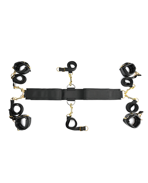 This Special Edition of our top selling Under the Bed Restraints takes play to another level. Easily incorporate your favorite restraint products utilizing the two additional restraint straps, now totaling six. Comfort with style is apparent with the addition of golden hardware including six durable, double sided clasps. Incorporate the lush soft blindfold to add anticipation to play. To use, simply slide the straps underneath your mattress for an instant bondage bedroom. Position the straps around the head of the mattress or around the sides. Pair with a feather, tickler, slapper or paddle. Use your free hands to tickle and tease your partner. Features: Fits any mattress, Easy to Install.Six adjustable restraint straps. Four high-quality faux leather wrist/ankle cuffs with buckle closure. All golden hardware. Six durable, double sided clasps. Thicker, more durable center connector strap. Added soft blindfold. Limited Lifetime Warranty. A strong nylon anchor connector strap slides under your mattress to secure six adjustable restraint straps. Four straps end in high-quality faux leather wrist and ankle cuffs with golden hardware while two are crafted with loops that promise leverage of all kinds. Position the straps around your mattress just the way you like them, tie your lover down tight, and slip the soft velvet blindfold over their eyes for a session full of surprises. Includes: 4 Wrist/Ankle Cuffs 6 60 (152cm) Adjustable Restraint Straps. 1 60.5 (154cm) Connector Strap. 6 Golden Double Ended Clasps. 1 Soft Blindfold.