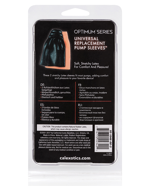 The phrase no pain, no gain is a thing of the past with this set of two Universal Replacement Pump Sleeves. These durable penis pump sleeves slip over the bottom of your penis pump cylinder to add much-needed comfort without breaking your airtight seal. Penis pumping works by using suction to create an airtight seal around your penis. Pumping up the air in the cylinder leads to increased pressure and blood flow to your penis. In the short-term, this means erections that are harder than ever. In the long-term, pumping encourages your penis to expand in both length and girth so you can achieve the size youve always wished for. Uncomfortably firm pressure isnt necessary with these pump sleeves. The soft latex material adds comfort and pleasure to your favorite deviceall while you keep training your rod to be the biggest and hardest it can be. Our pump sleeves fit most pump cylinders, so you can stretch them to fit easily over your favorite device. Theyre stretchy and durable to protect your manhood as you pump. The sleeves are body-safe and unscented for total peace of mind. Transform your pumping routine and give yourself the comfortable, pleasurable sessions you deserve with these pump sleeves