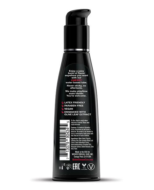 Keep calm and cherry on! Kissable, lickable, and delicious, Wicked Aqua Cherry personal lubricant adds subtle and delicious natural flavors to enhance oral pleasures. Light and silky, this water-based formula is the perfect sensual combination of an elegant lubricant and a flavor sensation. Never sticky and without an aftertaste, Wicked Aqua Cherry satisfies your sweet tooth and your intimate desires all in one amazing pleasure product. Oral sex never tasted so good. Whether you are giving or receiving, our flavors will give you a new sexy confidence.