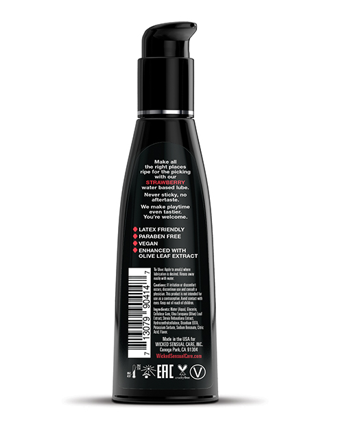 Bring Strawberries into the bedroom in a whole new way! Kissable, lickable, and delicious, Wicked Aqua Strawberry personal lubricant adds subtle and delicious natural flavors to enhance oral pleasures. Light and silky, this water-based formula is the perfect sensual combination of an elegant lubricant and a flavor sensation. Never sticky and without an aftertaste, Wicked Aqua Strawberry satisfies your sweet tooth and your intimate desires all in one amazing pleasure product. Oral sex never tasted so good. Whether you are giving or receiving, our flavors will give you a new sexy confidence.