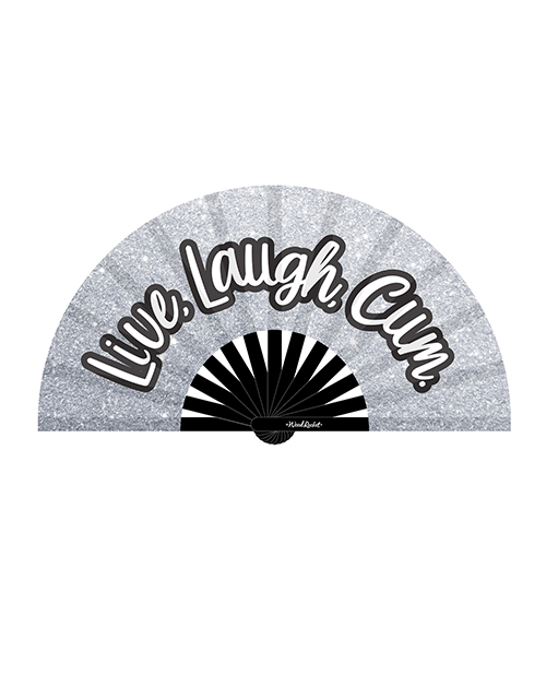 Cool yourself in style with this Live Laugh Cum large-sized folding hand fan. Simple and fun with just the right attitude! Made of glossy bamboo ribs and high-quality satin material.