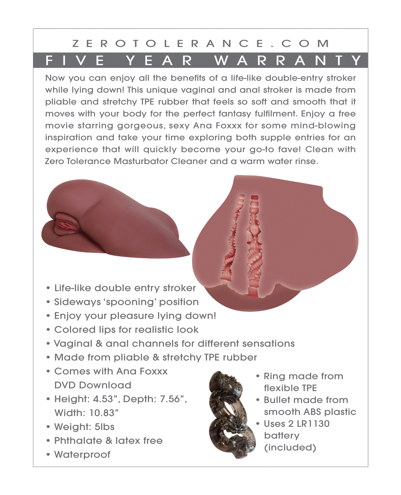Now you can enjoy all the benefits of a life-like double-entry stroker while lying down! This unique vaginal and anal stroker is made from pliable and stretchy TPE rubber that feels so soft and smooth that it moves with your body for the perfect fantasy fulfilment. Enjoy a free movie starring gorgeous, sexy Ana Foxxx for some mind-blowing inspiration and take your time exploring both supple entries for an experience that will quickly become your go-to fave! Clean with ZT Masturbator Cleaner and a warm water rinse.